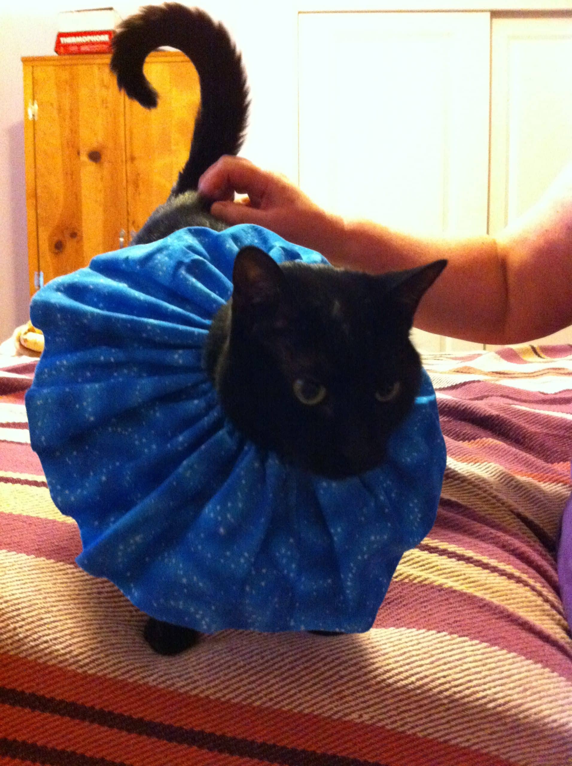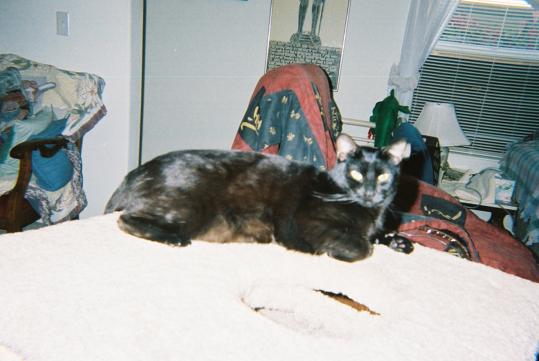 I was sitting on the stairs when I felt the brush of silky fur on the back of my legs. I lifted my skirt enough to see a pair of sharp jade green eyes looking back at me. I said, “Well, hello there. Who are you?” This sleek, black adolescent kitten quietly walked out from under my skirt, looking up at me intently. Silently, she jumped up onto my lap, stepped up onto my chest with her forepaws, got up into my face, gave me a few good sniffs, leaned back and went limp. Trusting me to catch her as she dropped into my arms, else she’d have fallen to the ground in a thump. She started to purr, completely and trustingly limp in my arms. She looked back at me with those gorgeous green eyes as if to say, “You are my human. You can take me home now.” And so I did. The foster mom had named her Tiki. But it did not suit her. When I asked her what she thought of the name Zhan, she responded to it. And so she became Pa’u Zhan Tiki Silk, but later grow out of that name and into her adult name of Pa’u Zotoh Zhan, her name sake from the TV fantasy series Farscape. She loved being cooed at: “I love my Pa’u Zhan! I love my precious Pa’u!” She’d cuff and purr and trill back at me. A very mutual love!